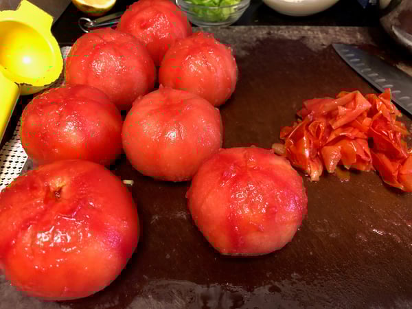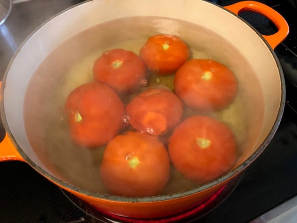 3. While dough is resting, cut an X in bottom of each tomato and blanch in a large pot of boiling water 10 seconds.