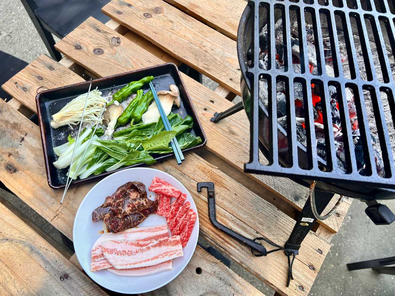 You can go to the local grocery store and pick up your favorite meats and vegetables or take the extra step to visit an Asian grocery which usually carries meats or items that are already prepared for this type of grilling. The meats are usually cut into small almost bite size pieces to make the grilling quick and easy. Do not confuse these meats with the very thinly sliced, shaved, or rolled, meats which are typically for Shabu (a Japanese hot pot dish).