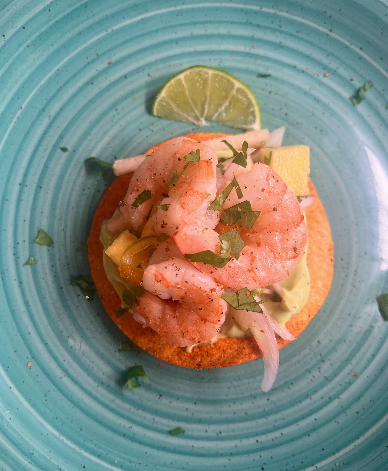 5. To assemble, spread crema on the tostada, followed by the slaw, topped with a few shrimp and garnish with cilantro and tajin seasoning