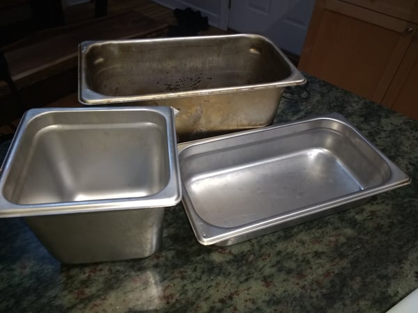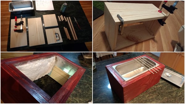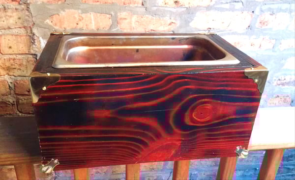 These are hotel pans. They are used in professional kitchens for cooking, holding and storing food. They are made of steel, very sturdy, and essentially, this is all you need for a homemade Yakitori grill. The one I use is rectangular, 1/3 size and 4 inches deep. It retails at just $6.99. Put it on some bricks (it will get very hot), fill it with charcoal, load up your skewers, you are good to go. After you’re done, tip it out, give it a wash and it’s back in your kitchen cupboard. An elegant solution, but not all that elegant to look at. I still had $13.01 left, so I bought a hand-saw and some wood glue, and built a wooden surround out of a 6x1 pine board: