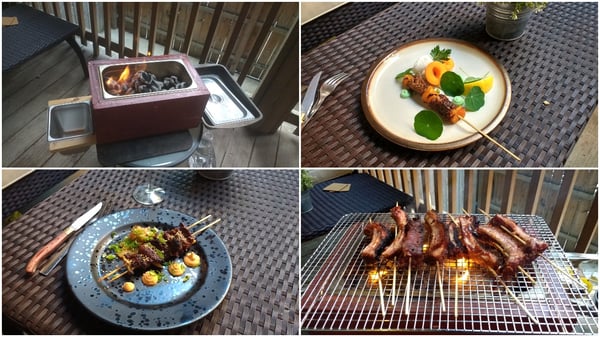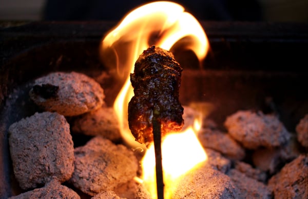 I like to build up the coals at one end for hot searing, and progressively move the skewers down to the cooler end to finish.
