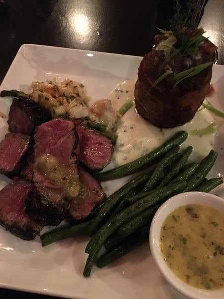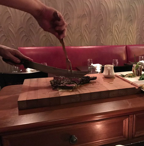 Finally, even though I am already stuffed with donuts and foie gras, we get to the main event; the star of the show; the pièce de résistance. I am, of course, referring to the steak. This IS a steakhouse after all. We decided to “go big or go home” as they say and opted for the 28 day dry aged ribeye for 2 which was a 28oz bone-in monstrosity, carved tableside. As if that wasn’t enough, we also decided to gild the lily and order it “Oscar style” with lump crab, asparagus, and béarnaise sauce. It was a phenomenal steak; perfectly cooked to medium-rare with rich beefy flavor from the dry-aging. You could definitely tell that the chef took the time to slowly render the fat from this well-marbled piece of meat and gave it an ample rest to allow it to reabsorb the juices for a juicy, tender, flavorful, and melt-in-your-mouth steak. As a very wise t-shirt once told me, “Bacon makes EVERYthing better” so I also wasn’t at all surprised that their bacon-wrapped twice-baked potato side was over-the-top delicious as well.