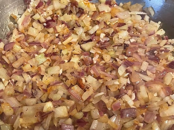 - In that same pan, sauté the fennel and red onion for about 5 minutes.