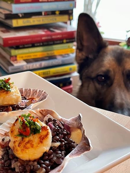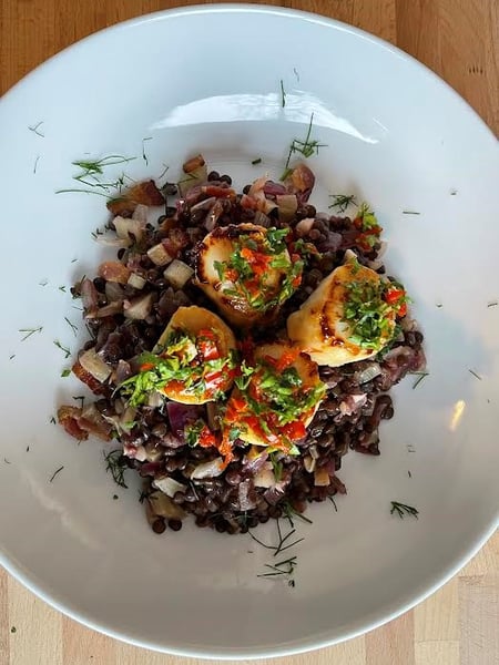 - If making as an entrée, I like a nice full bowl of lentils with about 4 scallops and a sprinkle of fennel fronds.