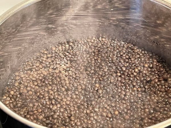 - In a medium size pot, add lentils and water. Over medium high heat, bring to a simmer and cover, slightly ajar. Set timer for 15 minutes.