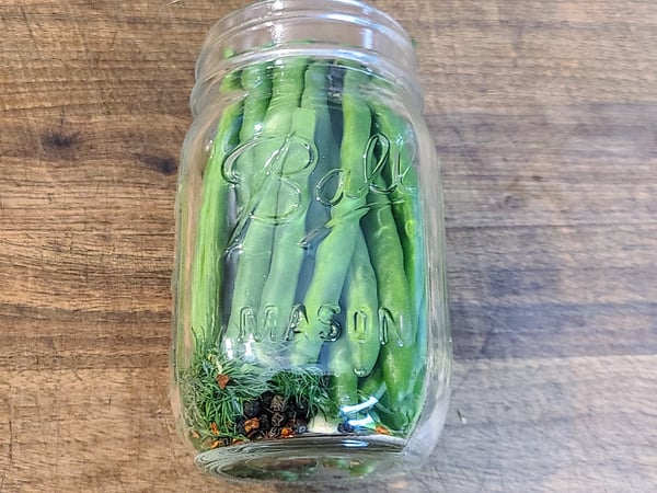 - Add the garlic, dill, and chili flakes to the jar with the green beans.