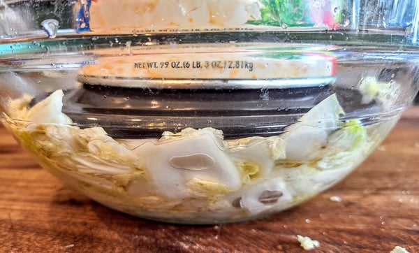 3. Add enough water to just cover the cabbage. Put a plate on top of the cabbage and weigh it down with something heavy. Let stand for 1 to 2 hours.