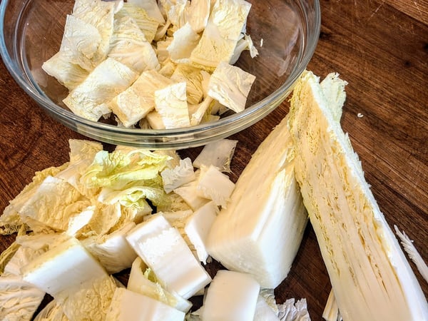 - Prepare the cabbage while the water is heating. Remove the bottom inch of the head of cabbage, and discard. Separate the leaves, and slice each leaf lengthwise into 1-inch pieces. Place the sliced cabbage in a large mixing bowl.