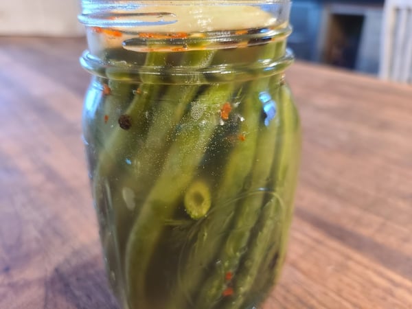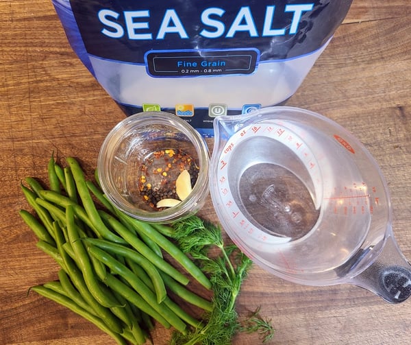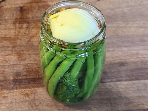 - Pour the brine into the jar with the green beans. There should be enough to submerge the green beans under the brine. If not, make more brine and add it to the jar. You may need to weigh down the green beans. I used a piece of fennel to keep the beans submerged under the brine.