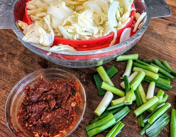 4. Rinse the cabbage under cold water 3 times. Set aside to drain in a colander for 15 to 20 minutes. Meanwhile, make the spice paste.