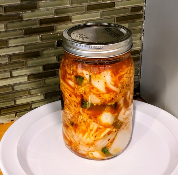 8. Pack the kimchi into a 1-quart jar. Press down on the kimchi until the brine (the liquid that comes out) rises to cover the vegetables, leaving at least 1 inch of space at the top. Seal the jar.