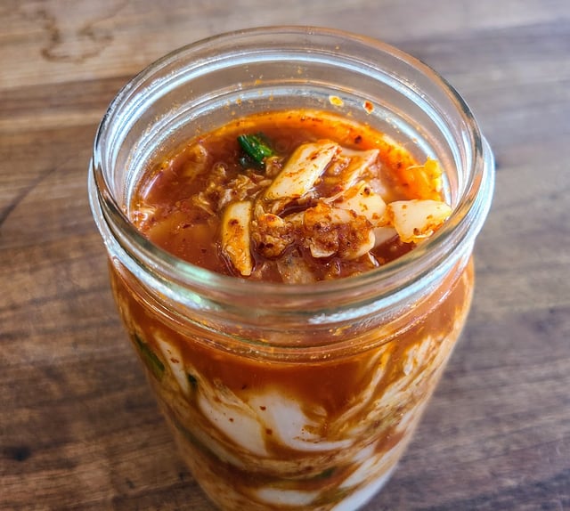 10. Check the kimchi once a day, opening the jar and pressing down on the vegetables with a spoon to keep them submerged under the brine. Taste a little at this point, too! When the kimchi tastes ripe enough for your liking, transfer the jar to the refrigerator. You may eat it right away, but it's best after another week or two.
