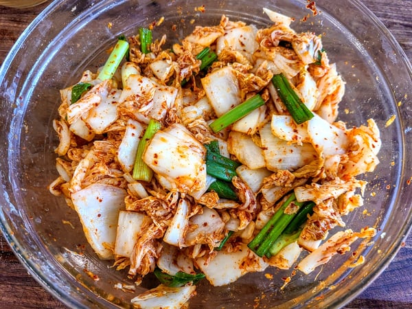 - Transfer the drained cabbage to a bowl, and add the chili mixture and sesame seeds. Using tongs, toss the cabbage to coat it thoroughly with the chili mixture. (If you prefer to mix with your hands, wear gloves to protect your skin from the chilis.) Adjust the seasoning as needed.