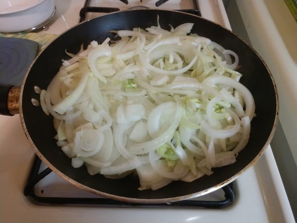 4. While the pastry is baking prepare the toppings. Heat a sauté pan over medium heat and add olive oil and butter. Add the sliced onions and fennel and sauté until both the fennel and onions are nicely caramelized, about 12 minutes. If a lot of fond builds up on the bottom of the pan, add a splash of water to deglaze.
