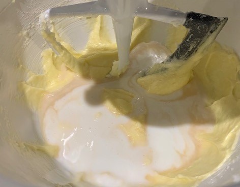 8. Add buttermilk, lemon juice, lemon zest, and vanilla. Mix on low speed until just combined.