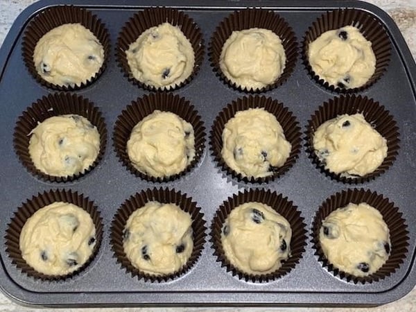 11. Use an ice cream scoop or spoon batter evenly into 12 muffin liners.