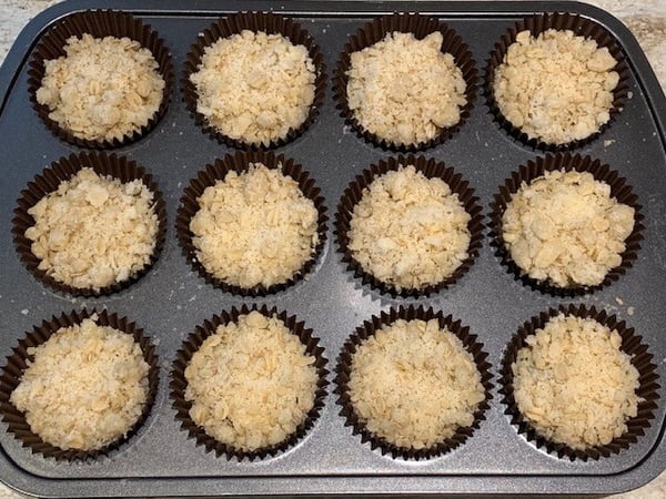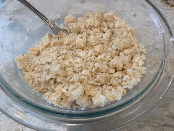 - Make Streusel Topping by combining melted and cooled butter, sugar, flour, and oats. Stir with a fork until pea-sized crumbs begin to form – will only take a few seconds. Set aside.