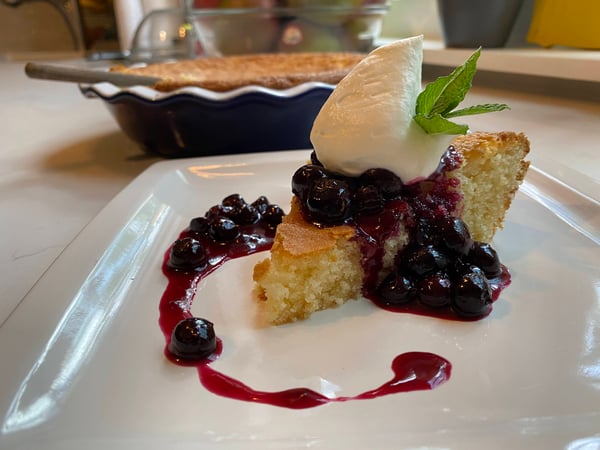 The original version has pockets of lemon curd baked into the cake, but because I like to utilize fresh berries this time of year, I serve my cake with a drizzle of fresh blueberry sauce and a dollop of whipped cream. Let me tell you… the sweetness of the blueberries and whipped cream is the absolute perfect complement for the tart cake!