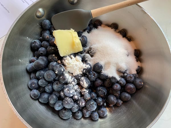 - While the cake is baking, prepare the blueberry sauce. In a small saucepan combine the butter, blueberries, sugar, cornstarch and lemon juice. Set over medium-high heat.