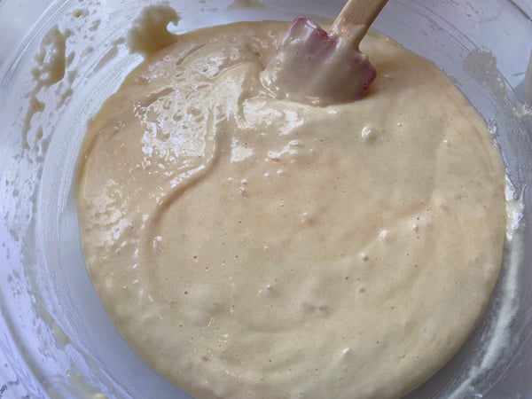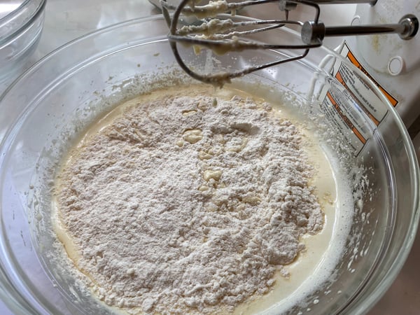 - Add the dry ingredients to the egg mixture slowly and combine well.