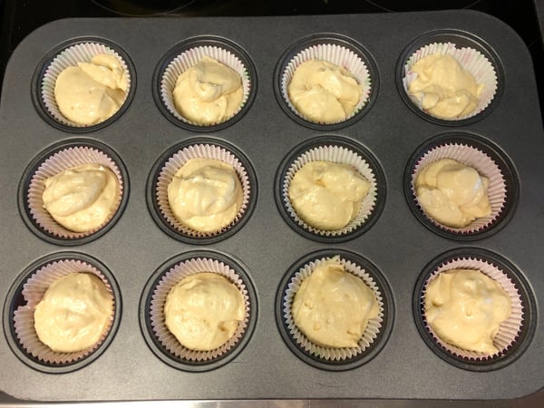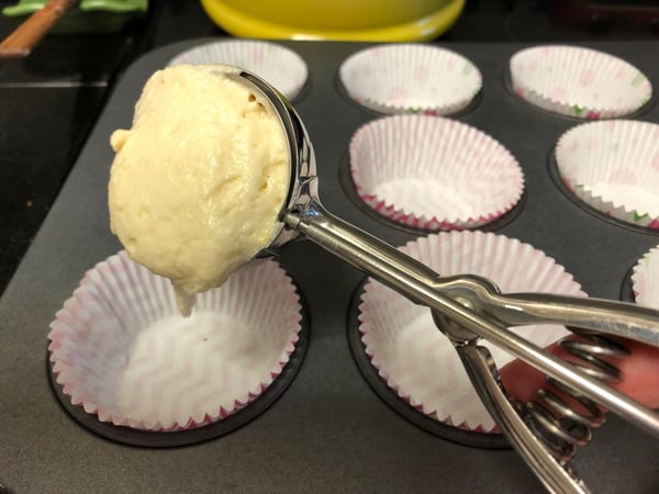 6. Use a scoop to fill the cupcake liners 2/3 of the way full and bake for 20 minutes. Cool the cupcakes before assembling.