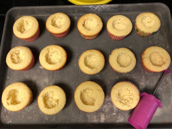1. Use a cupcake plunge or paring knife to remove the centers of the cooled cupcakes.
