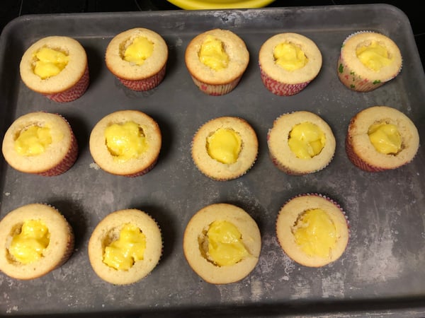2. Spoon 1 to 2 tablespoons of lemon curd into the opening of each cupcake.