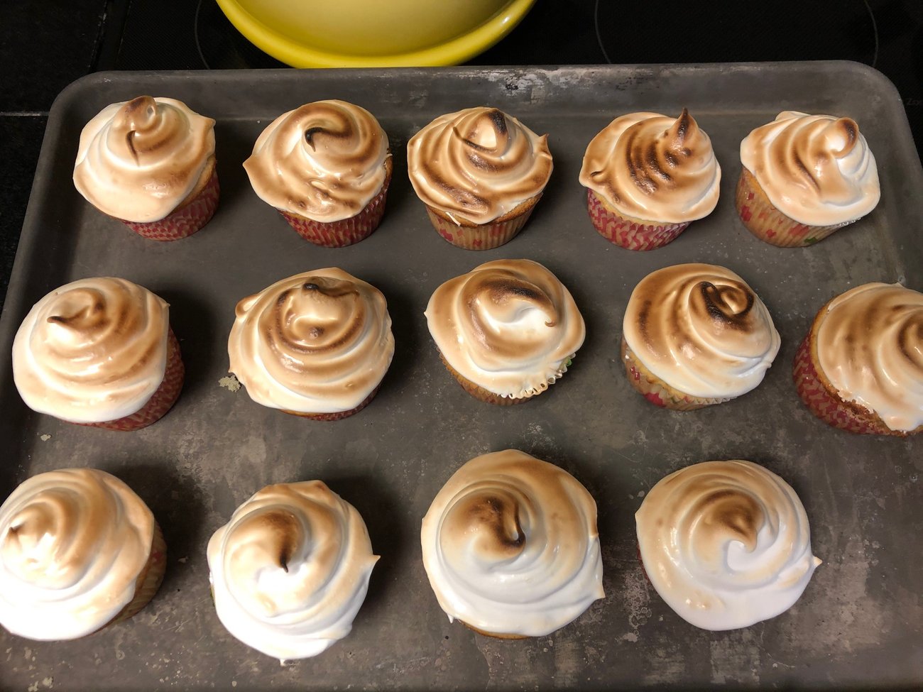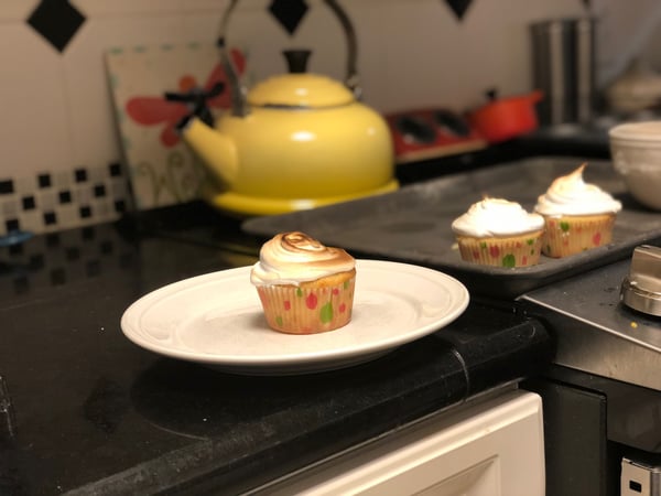 3. Heat broiler on high. Top the cupcakes with a large dollop of meringue and swirl with a small offset spatulal to form a slight point. Put under the broiler for less than a minute to toast the meringue. I keep the oven door open so that I can watch these like a hawk and rotate as necessary to avoid scorching the beautiful cupcakes. You can also use a kitchen torch if you have one (I do not).