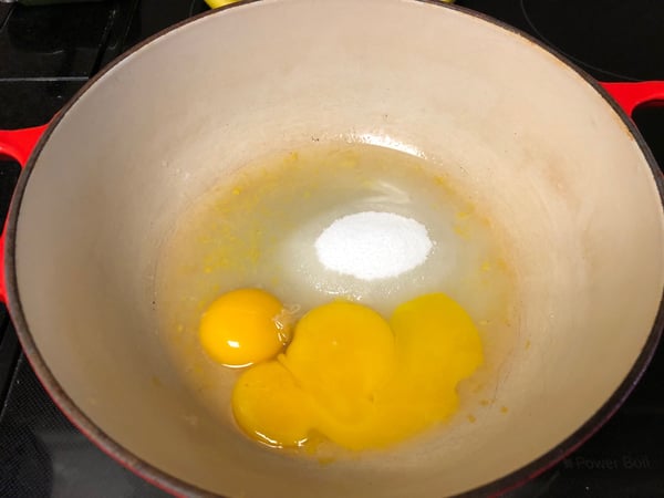 1. Combine the egg yolks, sugar, lemon juice and zest in a small saucepan. Whisk the ingredients together until smooth.