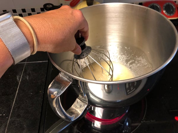 2. In a medium saucepan, bring an inch or two of water to a simmer over medium-low heat. Place the stand mixer bowl on top of the saucepan to create a double boiler (be sure the bottom of the bowl does not touch the water). Heat the mixture, whisking occasionally, until the sugar is completely dissolved and the mixture is hot to touch.
