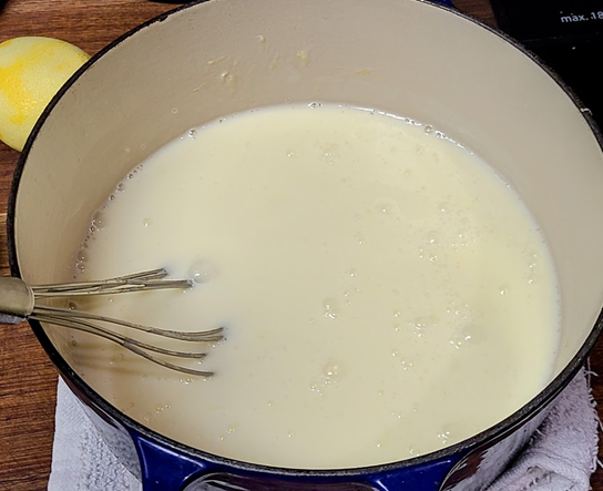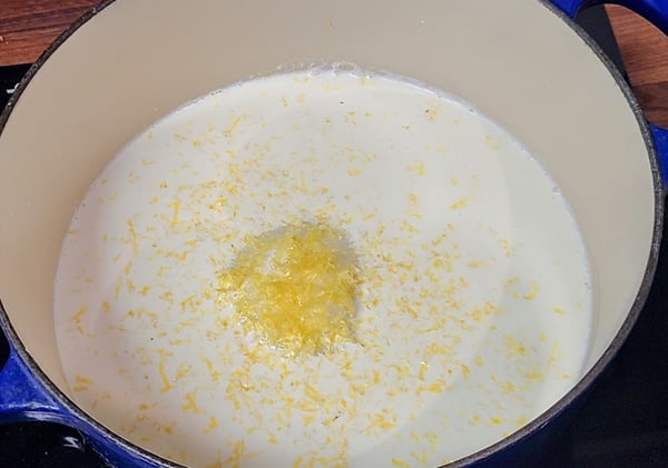 - Place the cream, sugar, and lemon zest in a saucepan. Heat over medium high heat.