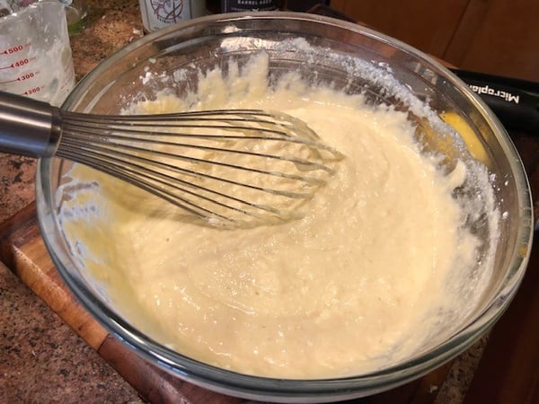 - Pour wet ingredients into the bowl of dry ingredients and whisk to combine (some lumps are okay).