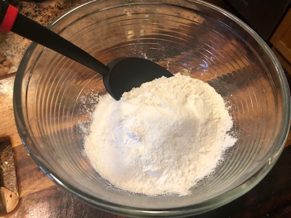 - In a medium bowl, mix together flour, sugar, baking powder, baking soda, and salt. Set aside.