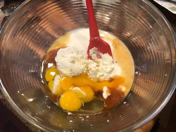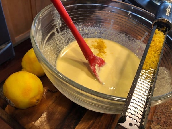 - In a separate medium bowl, mix together milk, 3/4 cup (remaining is for the top) ricotta, eggs, vanilla bean paste, lemon zest (I like to collect the zest the zest in my Microplane for easy transport), lemon juice, and melted butter.