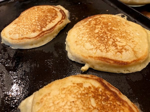 5. Butter your pre-heated pan and pour 1/2 cup of batter (or your desired size of pancake) onto pan. Be sure to leave room for the pancakes to spread out.
