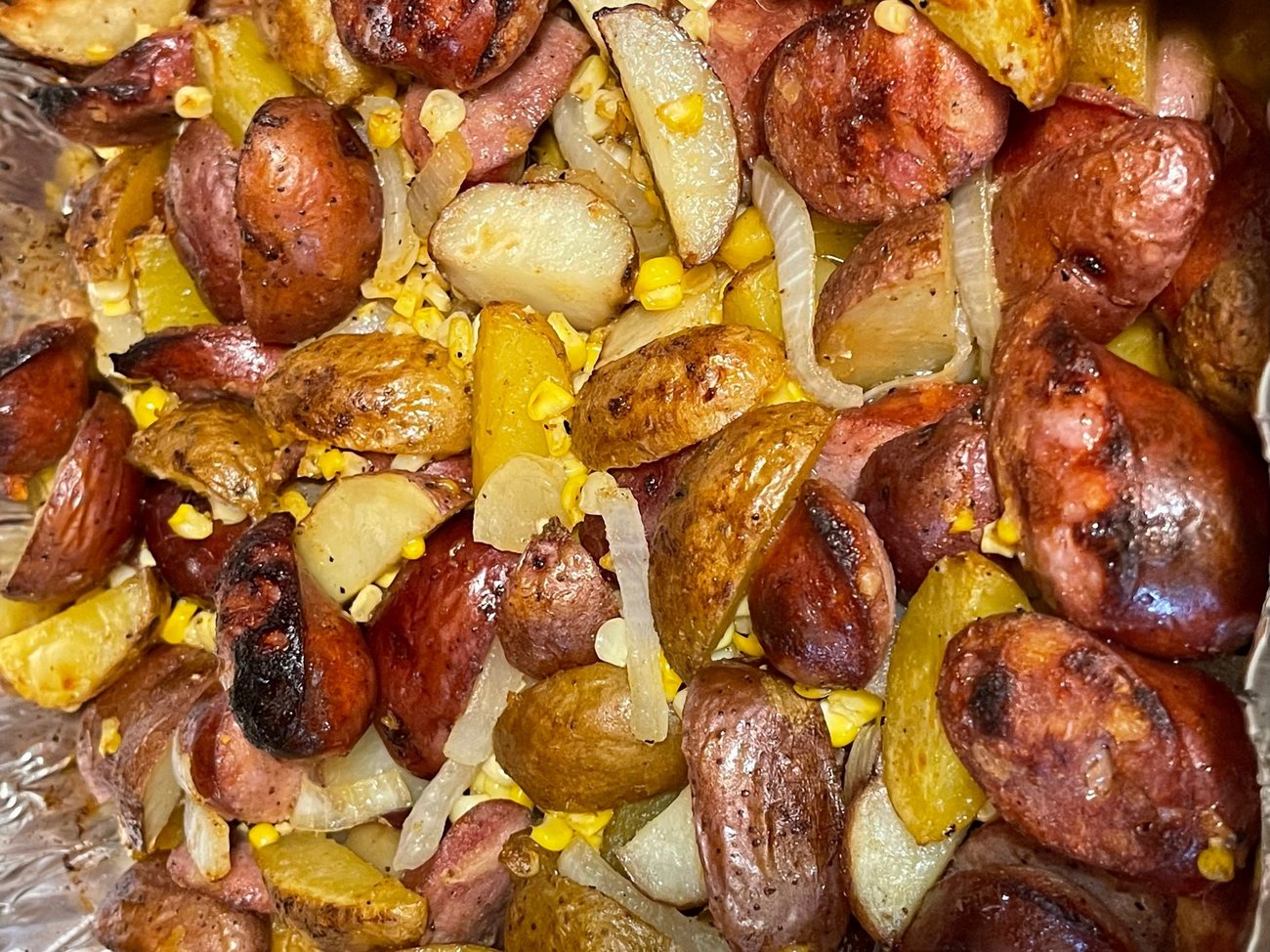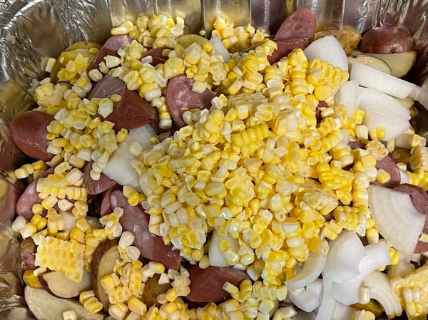 - Add the corn, onions, sausage and melted butter mixture to the partially roasted potatoes. Toss well making sure the seasoning is coating every item.