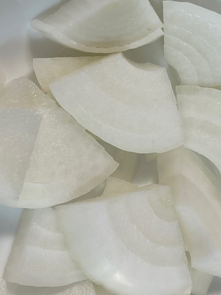 5. Cut the sausage on the bias into 1/2 -1 inch chunks. (I wrote that for anyone who takes our virtual classes and loves the discussions on cutting on the bias.)