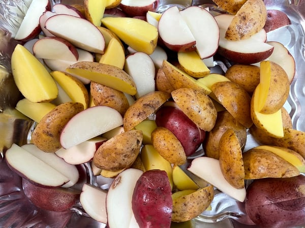 2. In a large pan, add quartered potatoes and toss with a light drizzle of olive oil. Cook for about 20 minutes. You want them to just start to roast not necessarily cook all the way.