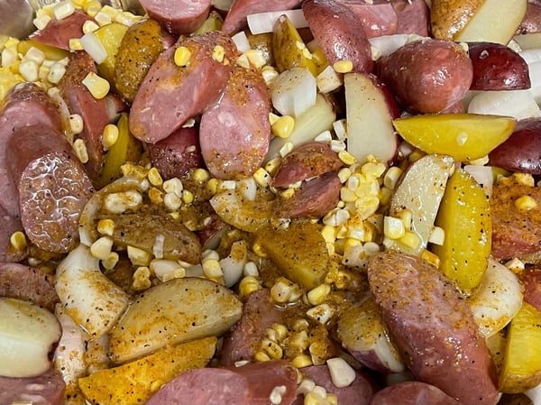 6. Add the corn, onions, sausage and melted butter mixture to the partially roasted potatoes. Toss well making sure the seasoning is coating every item.