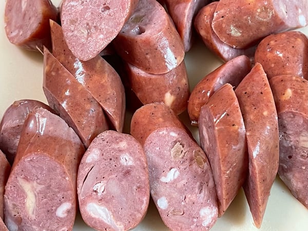 - Cut the sausage on the bias into 1/2 -1 inch chunks.