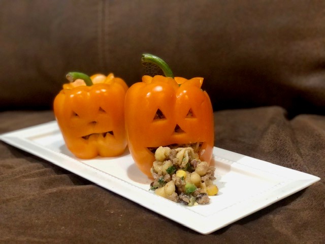 I chose to spice things up and did a southwestern mac n’ cheese in my peppers, but the options are endless. This is the perfect meal before you head out to trick-or-treat, or let’s be honest, adults will love these anytime too!
