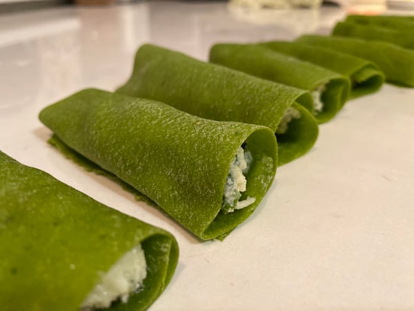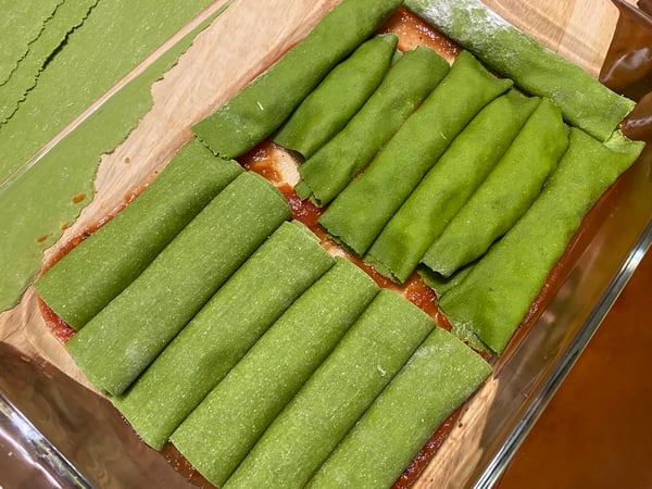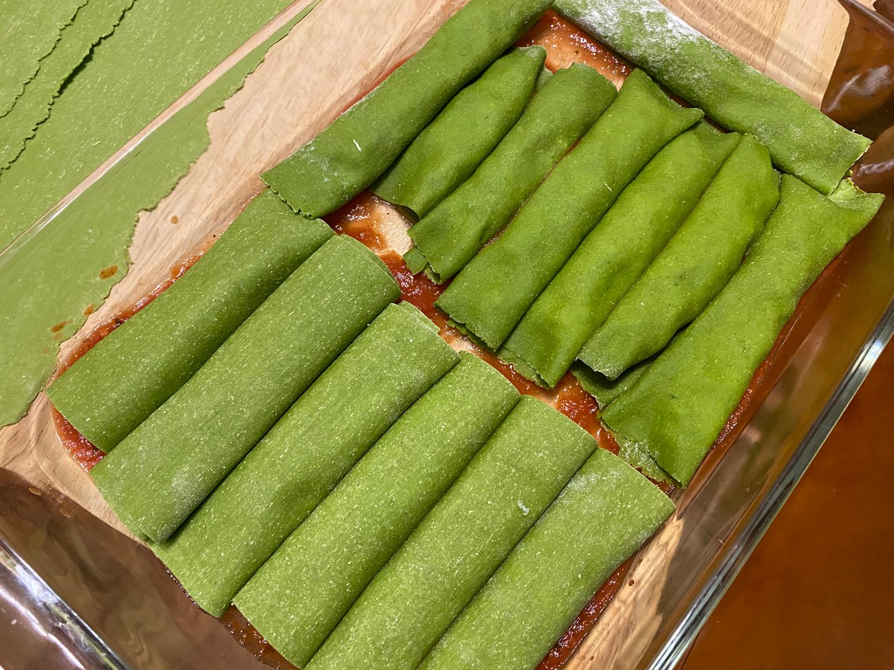 It’s been a while since I have made a filled pasta, and because I have been craving manicotti and am in the holiday spirit, I decided to try my hand at making Christmas color-inspired manicotti with homemade spinach pasta dough and a ricotta filling.