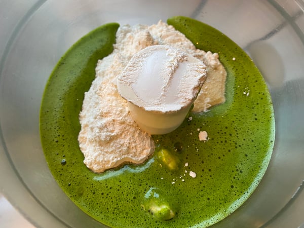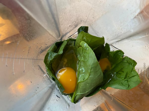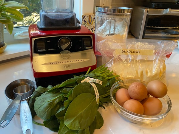 It’s just like making egg pasta dough, but with the addition of fresh spinach leaves. To incorporate the spinach and make for a smooth texture, I placed the washed spinach leaves and eggs together in a blender and pureed until smooth.