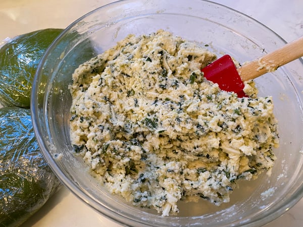 Now that the dough was done and resting, I worked on the filling. I kept it pretty simple, but also incorporated the spinach theme into the ricotta mixture. In a bowl, I mixed together ricotta cheese (full fat is the most flavorful, but use part skim if preferred - it will still be excellent), roasted garlic, frozen chopped spinach (squeezed dry), Parmesan cheese, mozzarella cheese, an egg for binding, salt and pepper. To make the assembly easier, I transferred the filling to a piping bag.