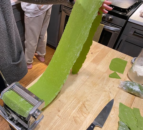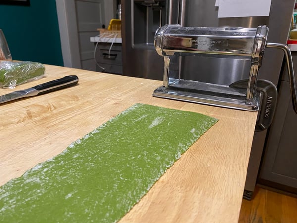 The first step is to roll the pasta dough into thin sheets using a pasta roller. You could do this with a rolling pin, but it would tack on some more time. If you are using a pasta roller, and your sheet of dough is getting too long for your counter, cut the dough in half and work with just one half at a time.