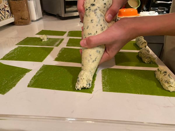 - Roll the spinach pasta dough into thin sheets (number 5 or 6 depending on your machine), and cut the sheets into 4- to 5-inch squares.