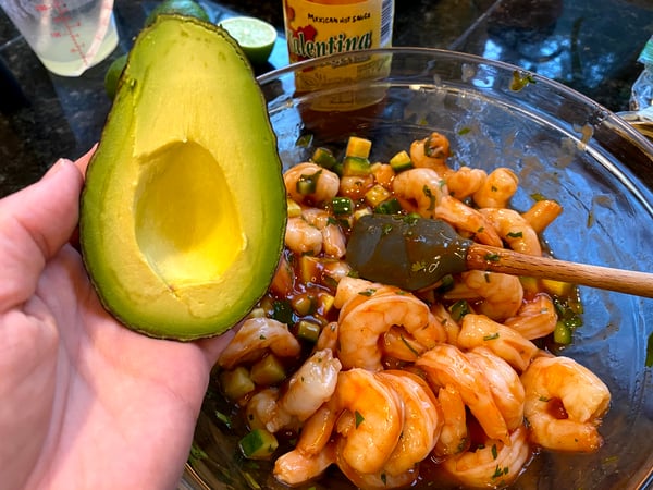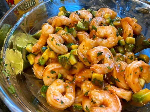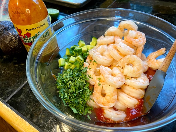 As mentioned before, the main ingredients are shrimp, avocado, hot sauce, tomato and lime, but after that every cook has their own favorite recipe. Some cooks add a dice of onion, jalapeño, celery and/or cucumbers. Some add a touch of the cooled down shrimp poaching liquid to achieve the correct consistency, while others add a splash of clam juice. For the tomato component, some cooks add a dice of fresh tomato in addition to ketchup and/or tomato juice or Clamato (clam juice cocktail). So, be as creative as you like! This recipe can be served as an appetizer or main course, and is traditionally served with saltine crackers on the side, but tortilla chips are great, too.