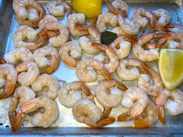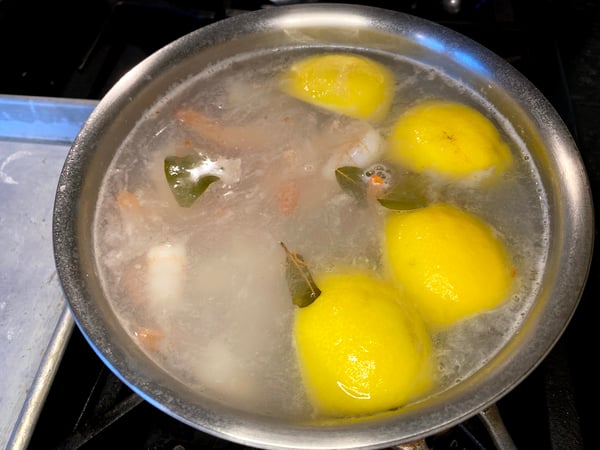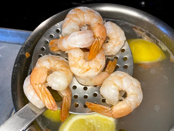 - To cook the shrimp, measure together the water, lemon, bay leaf and salt in a saucepan. Bring the poaching liquid to a boil, and add the shrimp. Bring the water back up to a gentle simmer, and cook the shrimp until they are just cooked through, 2 to 3 minutes.