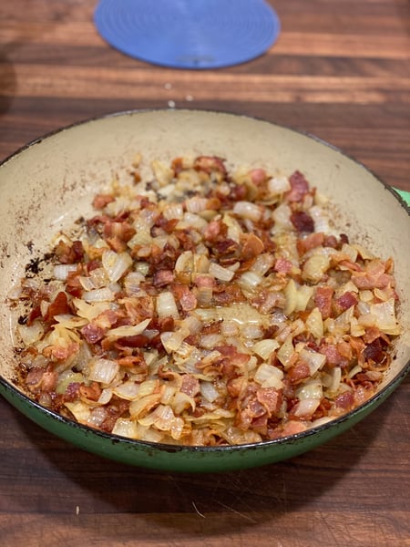 5. Heat a sauté pan over medium-low heat and add the bacon. Cook, stirring occasionally, until the bacon is crisp, about 10 minutes. Add the onions and cook until just softened, 5 to 6 minutes. Season with salt and pepper to taste.