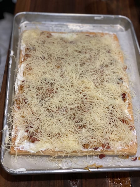 6. Using an offset spatula, spread the cheese/sour cream mixture evenly over the baked pastry. Scatter the bacon and onion mixture on top, and sprinkle with the Parmesan cheese.